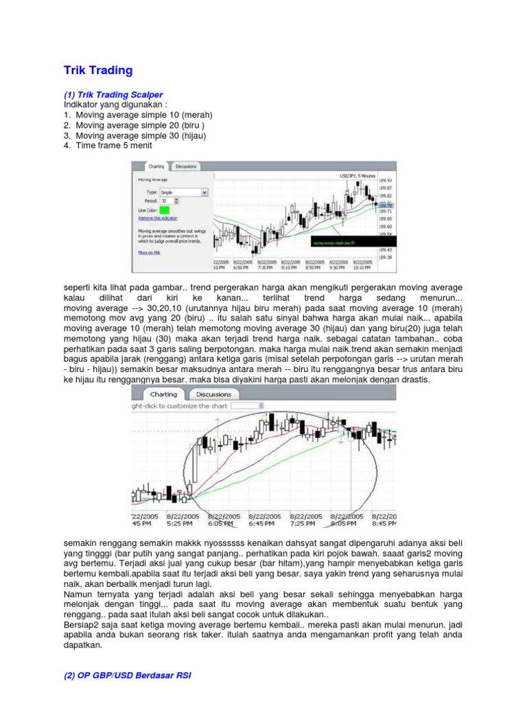 Trik trading. Mulai dari memanfaatkan jasa penasehat dari kalangan ahli, menggunakan indikator yang sifatnya teknikal, dan lain sebagainya. Saya memilih emas lalu saya analisa harga emas akan naik atau turun, jika naik, berarti saya pilih naik dan masukkan jumlah yang akan di trading. Teknik ini dikenal dengan membuka dan menutup sebuah atau beberapa posisi trading dalam tenggang waktu yang sangat singkat, terkenal juga dengan istilah terlihat untung, langsung sikat.ada sebuah anggapan bahwa metode scalping ini dianggap aman, sehingga teknik ini sangat familiar bagi pelaku pasar.
